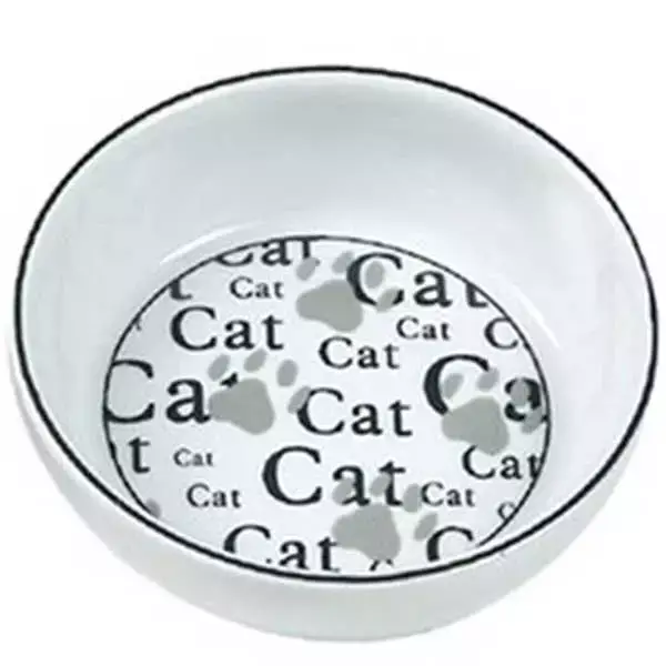 Kediler için, temizliği kolay, "Cat" yazısı Desenli seramik mama kabı. 4 cm yükseklik, 290 ml. 13 cm çapında.