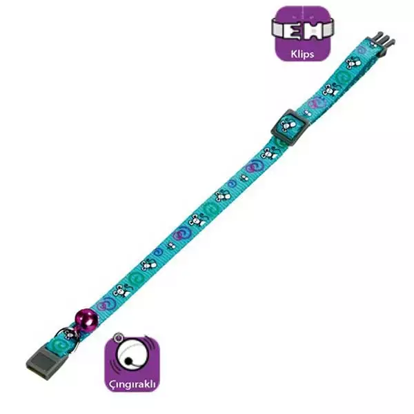 Flamingo Zilli Kedi Boyun Tasması 30cm Fare Desenli Turkuaz