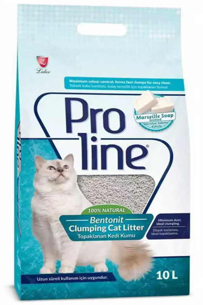 Proline marsilya sabunlu bentonit kedi kumu; Tamamen doğal hammadeler kullanılarak üretilmiştir. Standart tanecik boyutuna sahiptir. Topaklaşma özelliği sayesinde kolay temizlenmektedir. Toz miktarı minimum düzeye indirgenmiştir. Kedi kumu; Marsilya sabun kokusu sayesinde istenmeyen kokuların giderilmesine yardımcı olmaktadır.